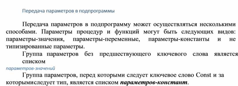 Передача параметров в подпрограмму может осуществляться несколькими способами. Параметры процедур и функций могут быть следующих видов: параметры-значения, параметры-переменные, параметры-константы и не типизированные параметры.