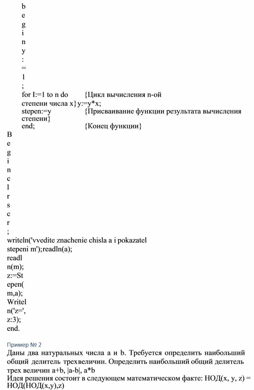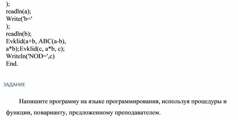 Evklid(a+b, ABC(a-b), a*b); Evklid(с, a*b, c); Writeln('NOD=',c)