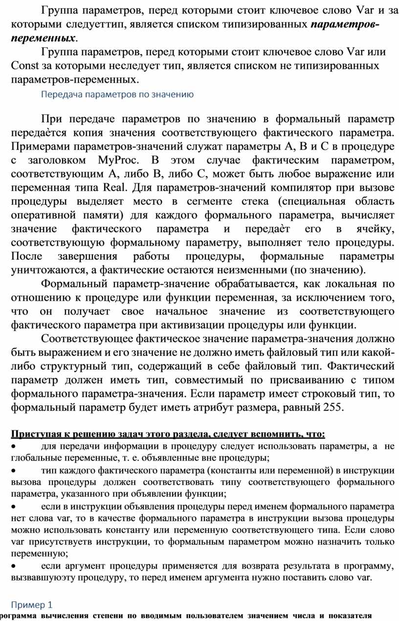 Соответствующее фактическое значение параметра-значения должно быть выражением и его значение не должно иметь файловый тип или какой-либо структурный тип, содержащий в себе файловый тип. Фактический параметр должен иметь тип, совместимый по присваиванию с типом формального параметра-значения. Если параметр имеет строковый тип, то формальный параметр будет иметь атрибут размера, равный 255.