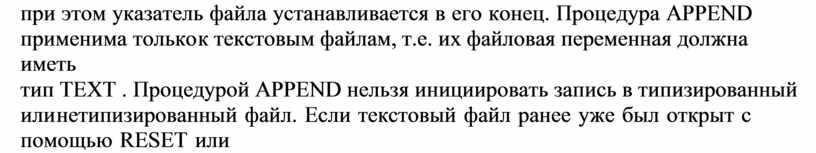 тип TEXT . Процедурой APPEND нельзя инициировать запись в типизированный или нетипизированный файл. Если текстовый файл ранее уже был открыт с помощью RESET или