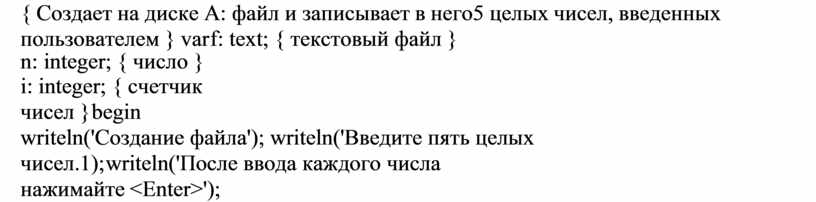 writeln('Создание файла'); writeln('Введите пять целых чисел.1); writeln('После ввода каждого числа нажимайте <Enter>');