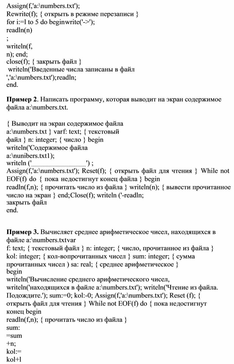 { Выводит на экран содержимое файла а:\numbers.txt } var f: text; { текстовый файл } n: integer; { число } begin writeln('Содержимое файла a:\nunibers.txt1);