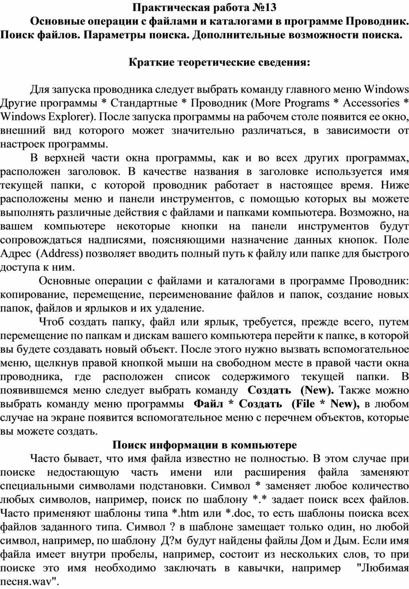 Основные операции с файлами и каталогами в программе Проводник. Поиск файлов. Параметры поиска. Дополнительные возможности поиска.