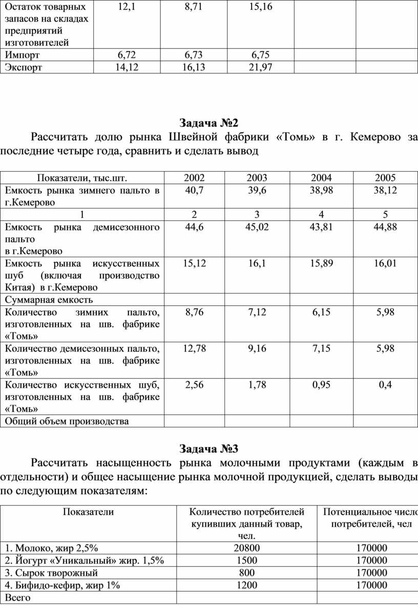 Рассчитать насыщенность рынка молочными продуктами (каждым в отдельности) и общее насыщение рынка молочной продукцией, сделать выводы по следующим показателям: