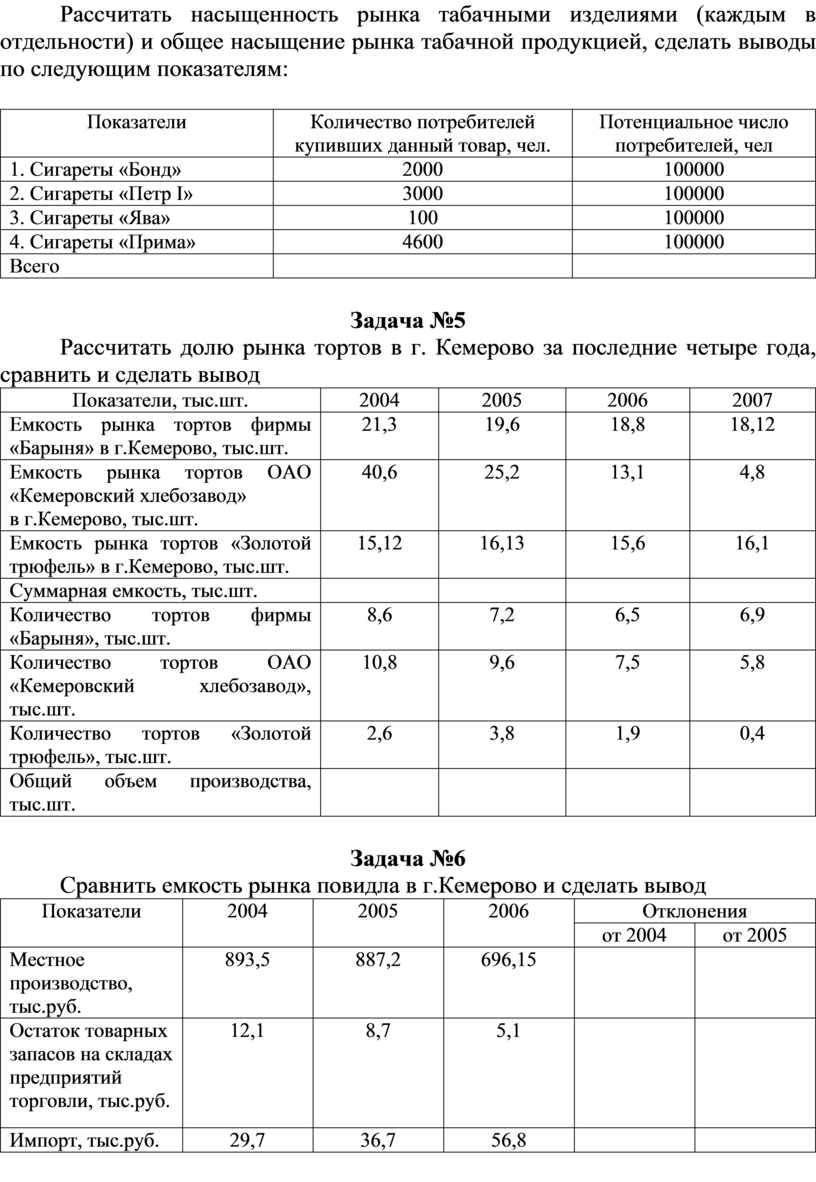 Рассчитать насыщенность рынка табачными изделиями (каждым в отдельности) и общее насыщение рынка табачной продукцией, сделать выводы по следующим показателям: