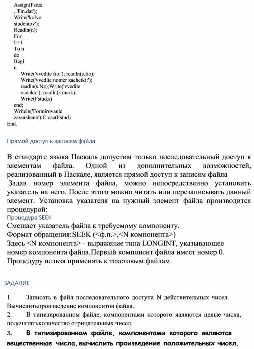 В стандарте языка Паскаль допустим только последовательный доступ к элементам файла. Одной из дополнительных возможностей, реализованный в Паскале, является прямой доступ к записям файла