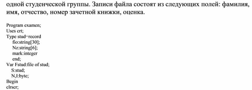 Type stud=record fio:string[30]; Nz:string[6]; mark:integer end;
