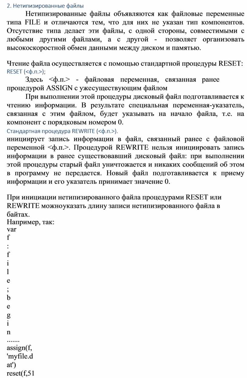 При работе с нетипизированными файлами могут применяться все процедуры и функции, доступные типизированным файлам, за исключением READ и WRITE