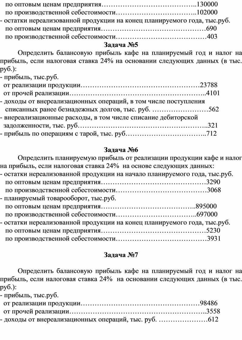 Определить балансовую прибыль кафе на планируемый год и налог на прибыль, если налоговая ставка 24% на основании следующих данных (в тыс. руб.):