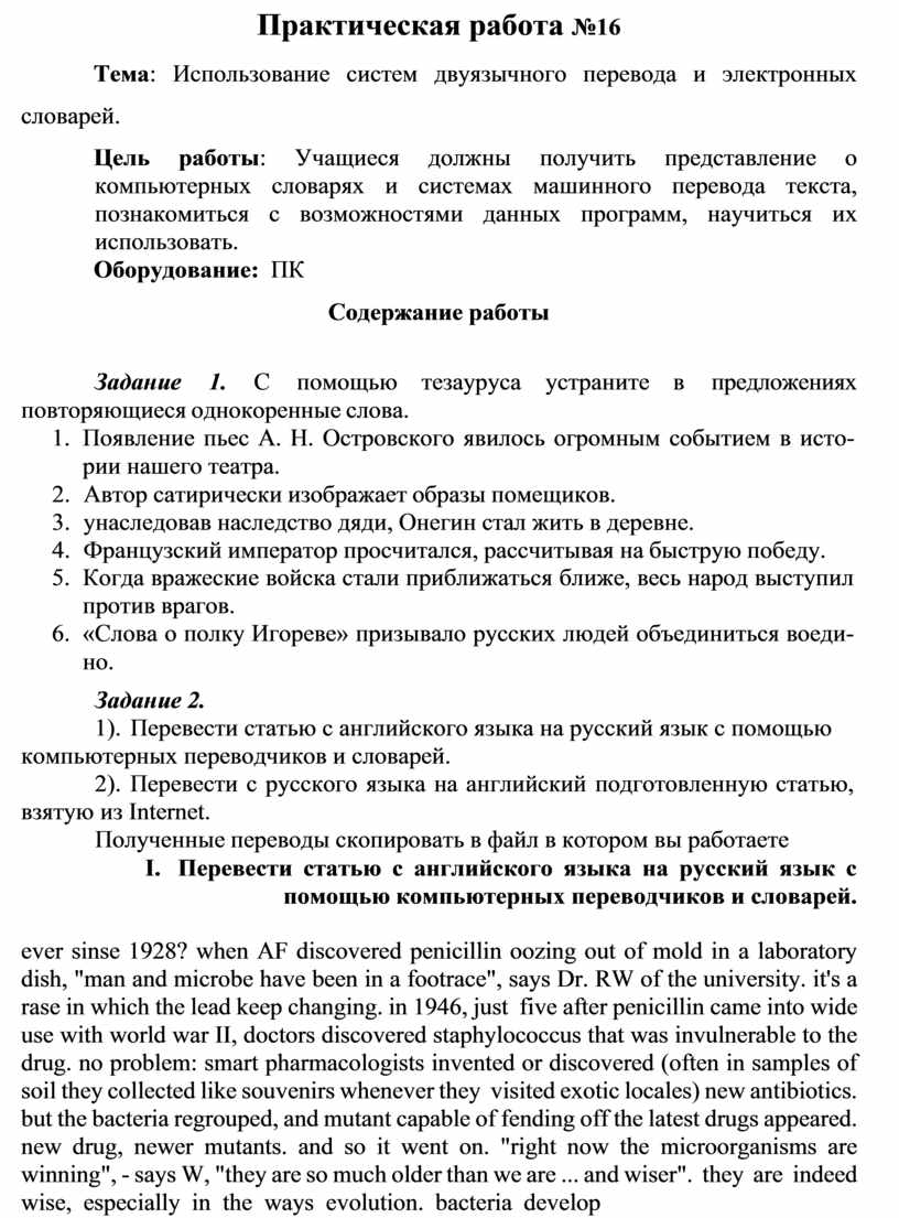 Цель работы: Учащиеся должны получить представление о компьютерных словарях и системах машинного перевода текста, познакомиться с возможностями данных программ, научиться их использовать.