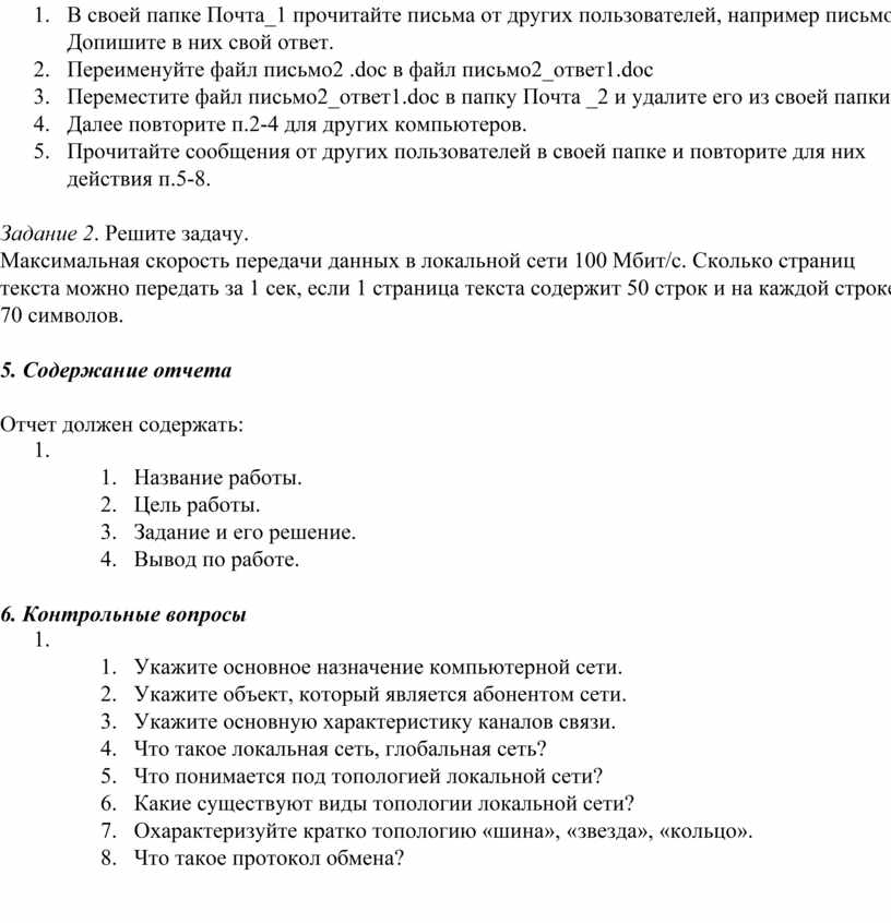 1. Цель работы: изучить понятие, связанные с программным и аппаратным обеспечением компьютерных сетей; выработать практические навыки обмена файлами между пользователями локальной компьютерной сети.