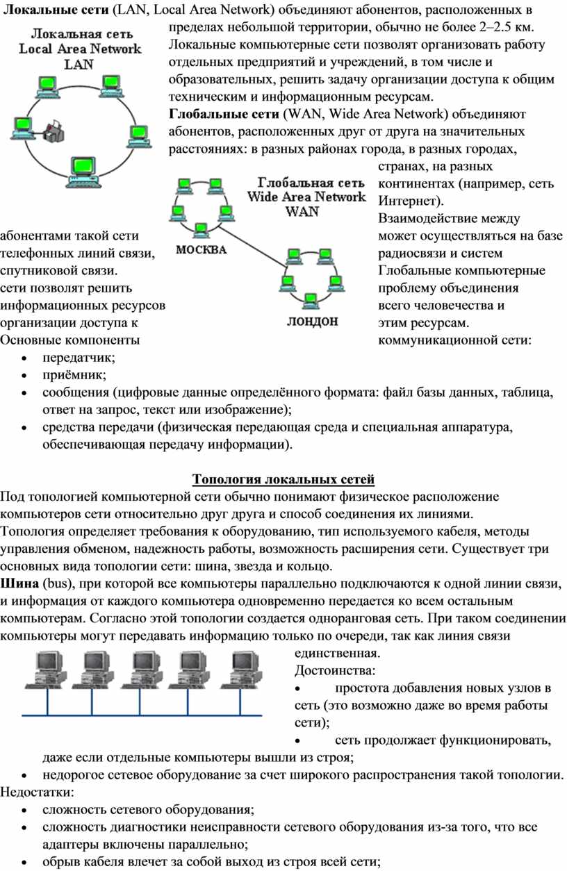 не более 2–2.5 км. Локальные компьютерные сети позволят организовать работу отдельных предприятий и учреждений, в том числе и образовательных, решить задачу организации доступа к общим техническим и информационным ресурсам. Глобальные сети (WAN, Wide Area Network) объединяют абонентов, расположенных