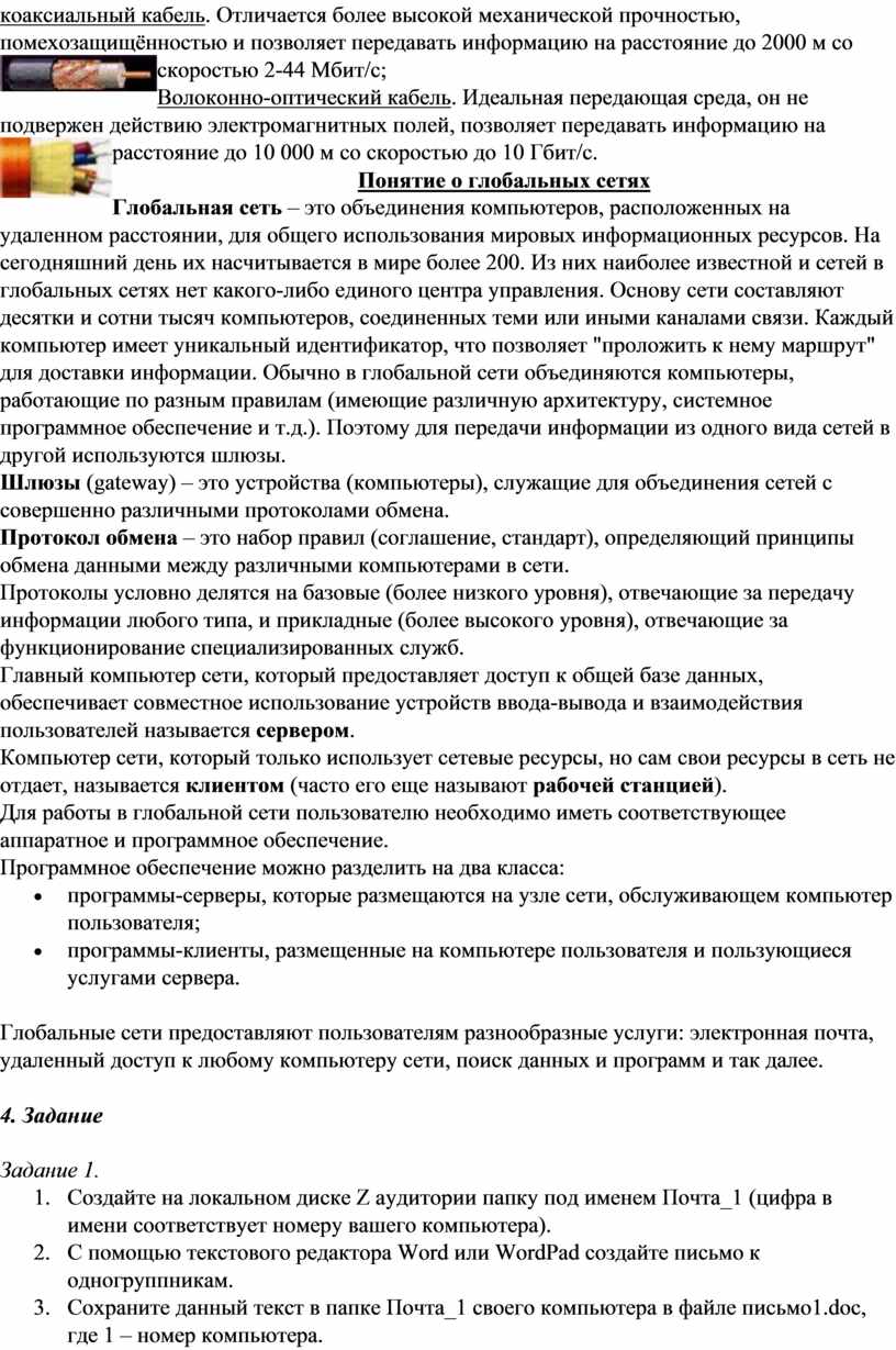 000 м со скоростью до 10 Гбит/с. Понятие о глобальных сетях Глобальная сеть – это объединения компьютеров, расположенных на удаленном расстоянии, для общего использования мировых информационных ресурсов. На сегодняшний день их насчитывается в мире более 200. Из них наиболее известной и сетей в глобальных сетях нет какого-либо единого центра управления. Основу сети составляют десятки и сотни тысяч компьютеров, соединенных теми или иными каналами связи. Каждый компьютер имеет уникальный идентификатор, что позволяет "проложить к нему маршрут" для доставки информации. Обычно в глобальной сети объединяются компьютеры, работающие по разным правилам (имеющие различную архитектуру, системное программное обеспечение и т.д.). Поэтому для передачи информации из одного вида сетей в другой используются шлюзы. Шлюзы (gateway) – это устройства (компьютеры), служащие для объединения сетей с совершенно различными протоколами обмена. Протокол обмена – это набор правил (соглашение, стандарт), определяющий принципы обмена данными между различными компьютерами в сети. Протоколы условно делятся на базовые (более низкого уровня), отвечающие за передачу информации любого типа, и прикладные (более высокого уровня), отвечающие за функционирование специализированных служб. Главный компьютер сети, который предоставляет доступ к общей базе данных, обеспечивает совместное использование устройств ввода-вывода и взаимодействия пользователей называется сервером. Компьютер сети, который только использует сетевые ресурсы, но сам свои ресурсы в сеть не отдает, называется клиентом (часто его еще называют рабочей станцией). Для работы в глобальной сети пользователю необходимо иметь соответствующее аппаратное и программное обеспечение. Программное обеспечение можно разделить на два класса: