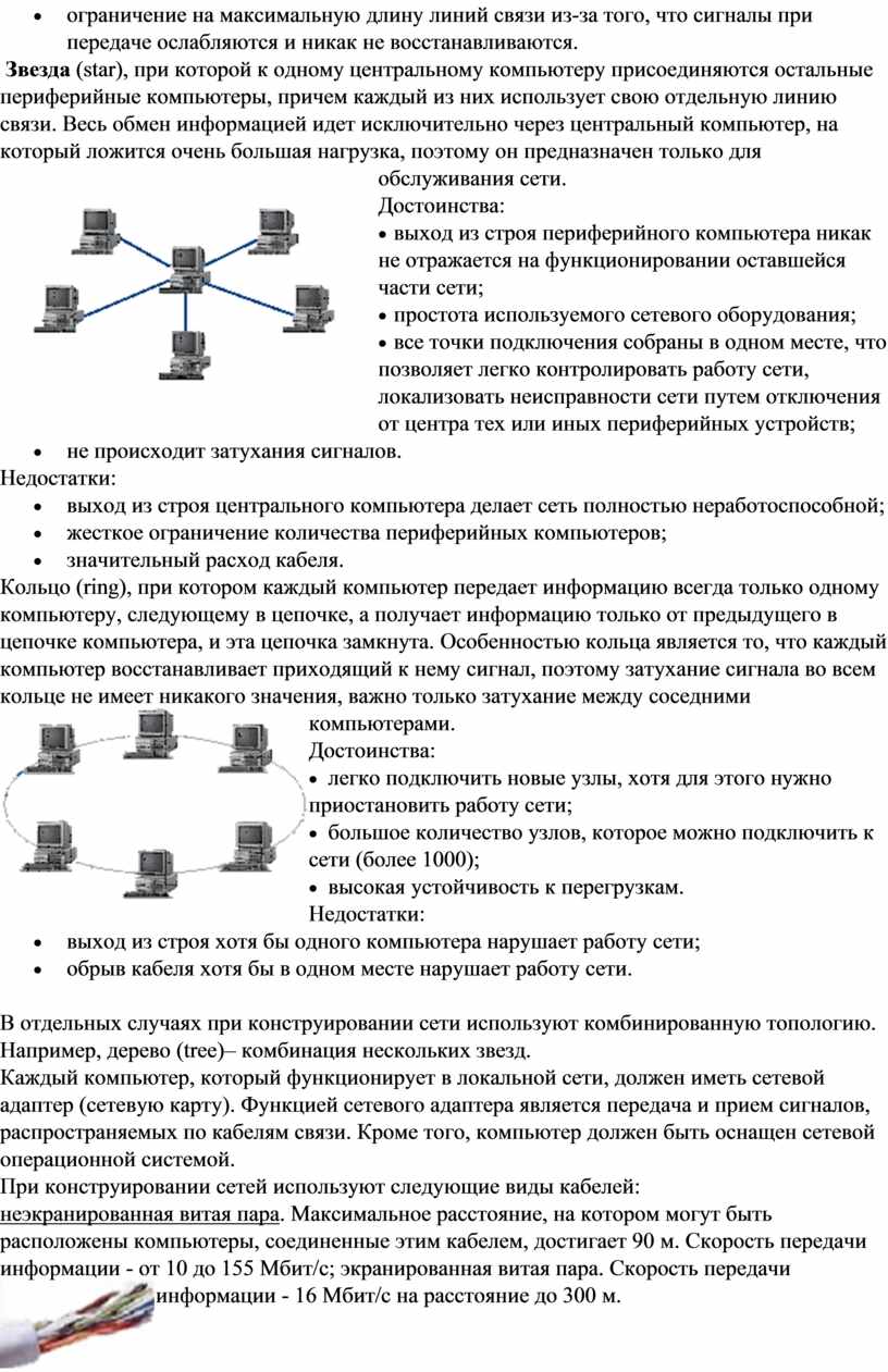 В отдельных случаях при конструировании сети используют комбинированную топологию. Например, дерево (tree)– комбинация нескольких звезд. Каждый компьютер, который функционирует в локальной сети, должен иметь сетевой адаптер (сетевую карту). Функцией сетевого адаптера является передача и прием сигналов, распространяемых по кабелям связи. Кроме того, компьютер должен быть оснащен сетевой операционной системой. При конструировании сетей используют следующие виды кабелей: неэкранированная витая пара. Максимальное расстояние, на котором могут быть