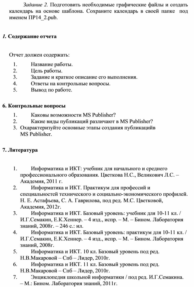 Задание 2. Подготовить необходимые графические файлы и создать календарь на основе шаблона. Сохраните календарь в своей папке под именем ПР14_2.pub.