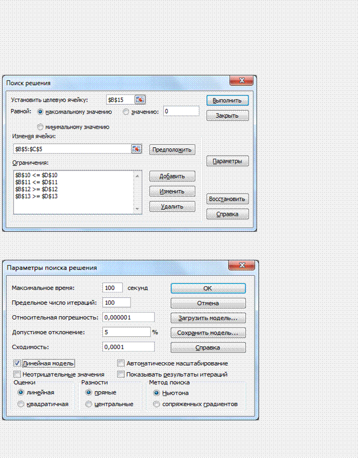 => установить флажок линейная модель. Остальная информация на форме Параметры поиска решения чисто служебная, автоматически устанавливаемые значения нас устраивают, и вникать в их смысл не будем. Щелкнуть на кнопке ОК. Снова откроется форма Поиск решения.