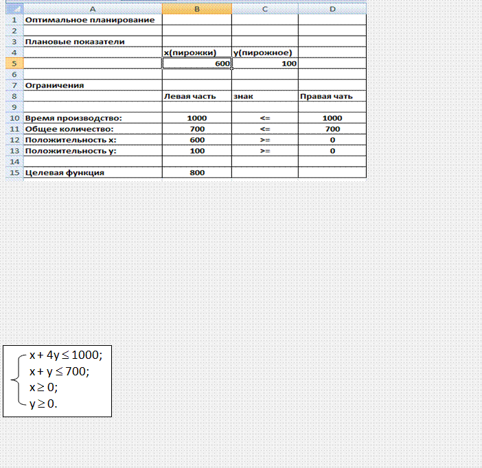 Цель работы: получение представления о построении оптимального плана методом линейного программирования; практическое освоение раздела Microsoft Excel «Поиск решения» для построения оптимального плана. Используемое программное обеспечение: табличный процессор Microsoft Excel. Справочная информация Средство, которое используется в данной работе, называется Поиск решения. Соответствующая команда находится в меню Сервис. Поиск решения — одно из самых мощных средств табличного процессора Excel. Задание 1 Реализовать поиск оптимального решения для задачи планирования работы школьного кондитерского цеха; 1. Подготовить таблицу к решению задачи оптимального планирования. В режиме отображения формул таблица показана на рисунке. Ячейки В5 и С5 зарезервированы соответственно для значений х (план по изготовлению пирожков) и у (план по изготовлению пирожных). Ниже представлена система неравенств, определяющая ограничения на искомые решения. Неравенства разделены на левую часть (столбец В) и правую часть (столбец D). Знаки неравенств в столбце С имеют чисто оформительское значение. Целевая функция занесена в ячейку В15 |