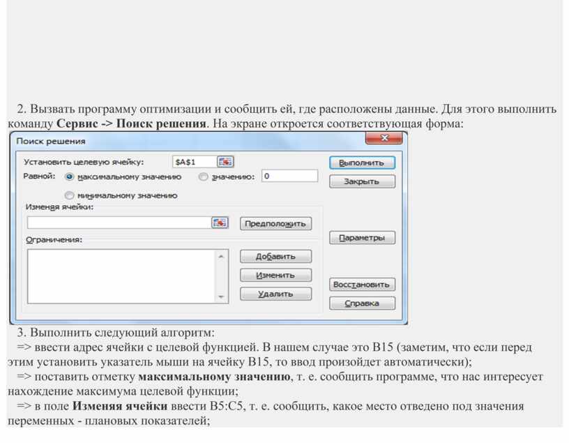 3. Выполнить следующий алгоритм: => ввести адрес ячейки с целевой функцией. В нашем случае это В15 (заметим, что если перед этим установить указатель мыши на ячейку В15, то ввод произойдет автоматически); => поставить отметку максимальному значению, т. е. сообщить программе, что нас интересует нахождение максимума целевой функции; => в поле Изменяя ячейки ввести В5:С5, т. е. сообщить, какое место отведено под значения переменных - плановых показателей; |
