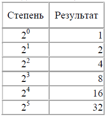 Для этого в сценарии используйте метод write(…) объекта document для формирования содержимого страницы. На каждой итерации цикла for сформируйте очередную строку таблицы, в первую ячейку которой заносится соответствующая степень двойки, а во вторую результат ее возведения в указанную степень. Для выполнения этого действия используется встроенный объект Math и его метод pow(…), возводящий первый параметр в степень, заданную вторым параметром. Обратите внимание, что метод write(…) может вызываться с любым количеством фактических параметров. Результатом его работы в любом случае является вывод в документ строки, полученной конкатенацией всех параметров, переданных в метод.