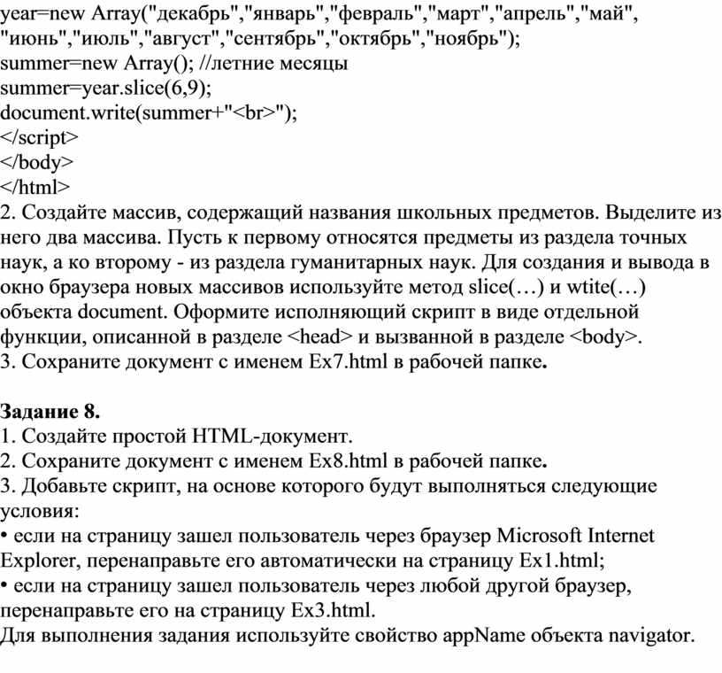 2. Создайте массив, содержащий названия школьных предметов. Выделите из него два массива. Пусть к первому относятся предметы из раздела точных наук, а ко второму - из раздела гуманитарных наук. Для создания и вывода в окно браузера новых массивов используйте метод slice(…) и wtite(…) объекта document. Оформите исполняющий скрипт в виде отдельной функции, описанной в разделе <head> и вызванной в разделе <body>.