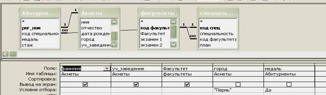 ð Получить список всех абитуриентов, поступающих на юридический факультет, имеющих производственный стаж. Указать фамилию, город, специальность и стаж. Упорядочить по фамилиям. (Имя запроса: юрфак).