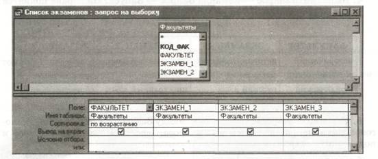 5. Сохранить запрос; выполнить команду Запрос ® Сохранить; в диалоговом окне, запрашивающем имя запроса, ввести «Список экзаменов» и подтвердить сохранение.
