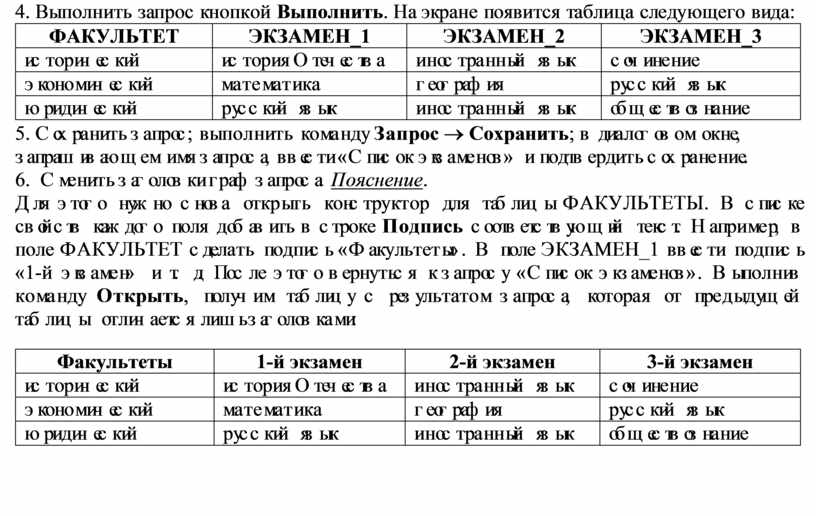 Для этого нужно снова открыть конструктор для таблицы ФАКУЛЬТЕТЫ. В списке свойств каждого поля добавить в строке Подпись соответствующий текст. Например, в поле ФАКУЛЬТЕТ сделать подпись «Факультеты». В поле ЭКЗАМЕН_1 ввести подпись «1-й экзамен» и т. д. После этого вернуться к запросу «Список экзаменов». Выполнив команду Открыть, получим таблицу с результатом запроса, которая от предыдущей таблицы отличается лишь заголовками:
