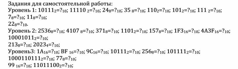 Уровень 2: 25368=?10; 4107 8=?10; 3718=?10; 11012=?10; 1578=?10; 1F316=?10; 4A3F16=?10; 100010112=?10;