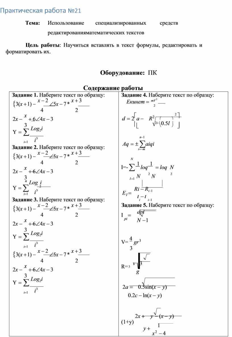 Задание 1. Наберите текст по образцу: {3(х + 1) - х - 2 Ð5х - 7 * х + 3 4 2 2х - х + 6Ð4х - 3 3 U = å Log2i n