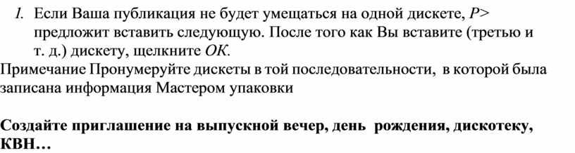 8. Если Ваша публикация не будет умещаться на одной дискете, Р> предложит вставить следующую. После того как Вы вставите (третью и т. д.) дискету, щелкните ОК.