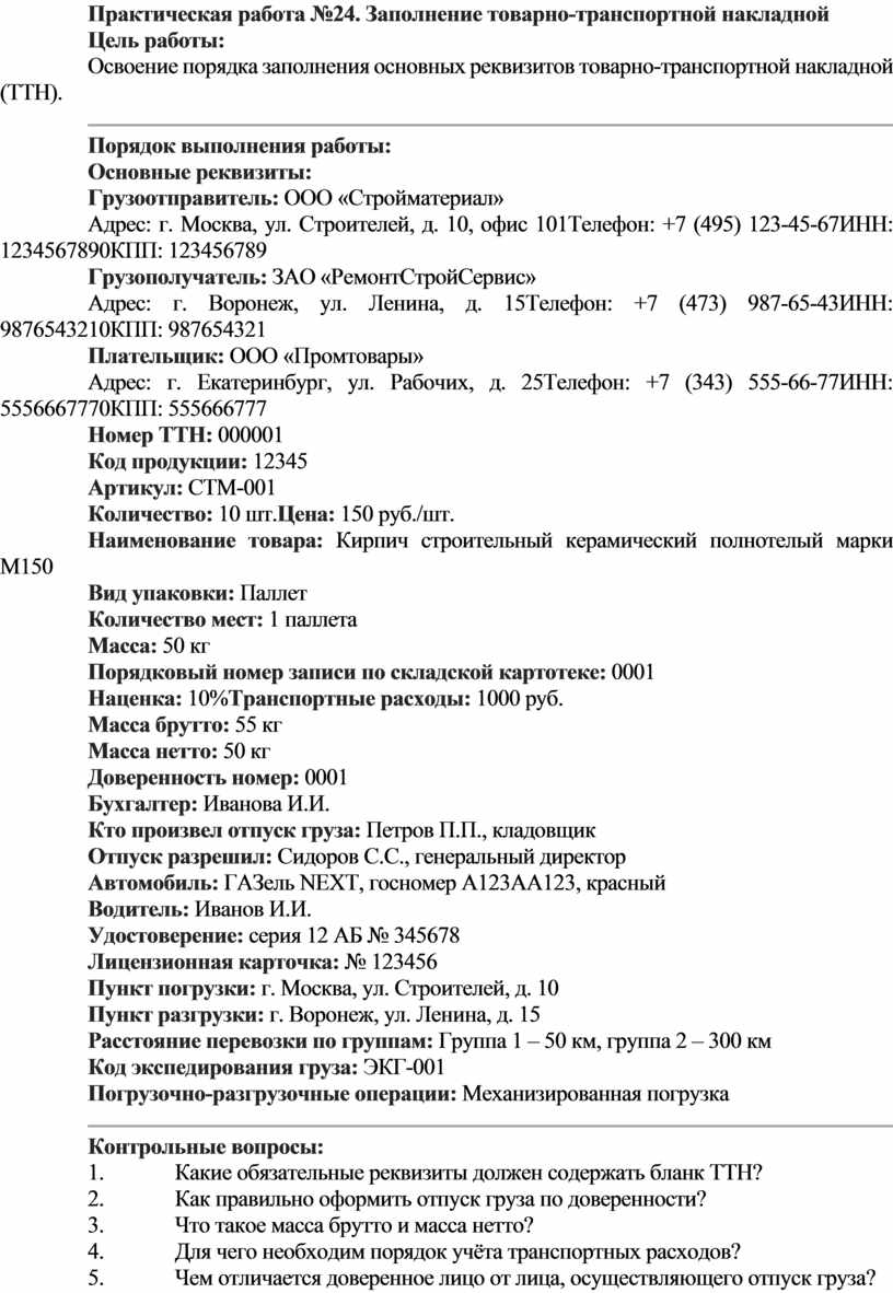 Освоение порядка заполнения основных реквизитов товарно-транспортной накладной (ТТН).