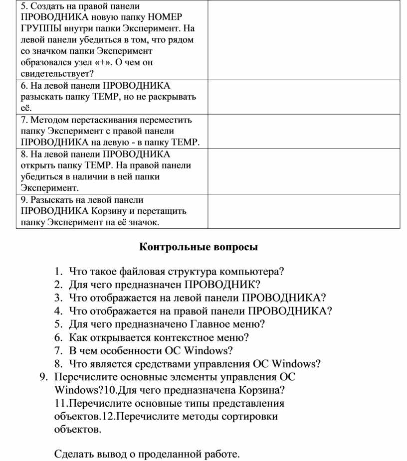 5. Создать на правой панели ПРОВОДНИКА новую папку НОМЕР ГРУППЫ внутри папки Эксперимент. На левой панели убедиться в том, что рядом со значком папки Эксперимент образовался узел «+». О чем он свидетельствует? |