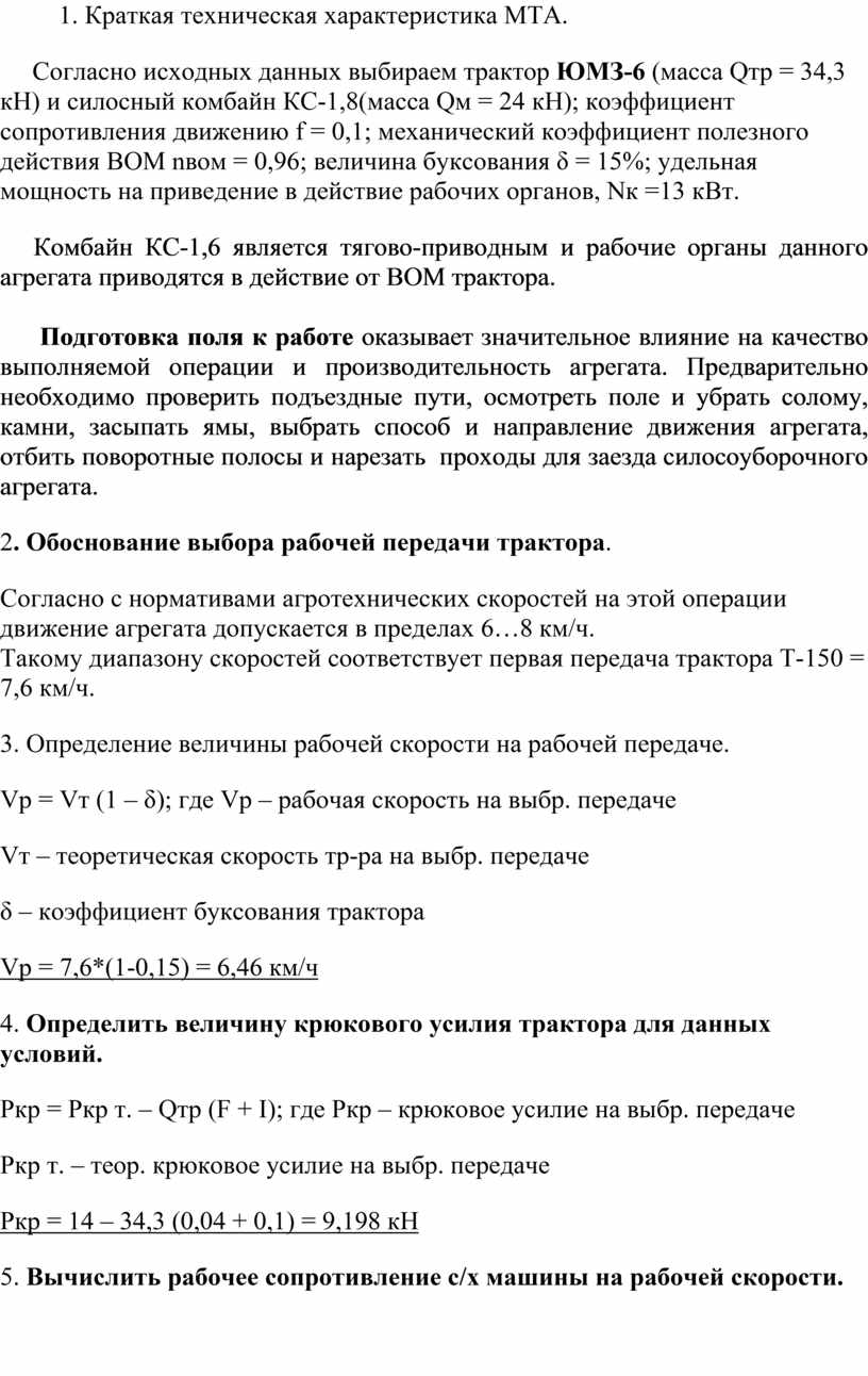 Краткая техническая характеристика МТА (характеристика трактора и с/х машины, способ агрегатирования). Обоснование выбора рабочей передачи трактора. Определение величины рабочей скорости на рабочей передаче. Определить величину крюкового усилия трактора для данных условий. Вычислить рабочее сопротивление с/х машины на рабочей скорости. Вычислить коэффициент использования тягового усилия.