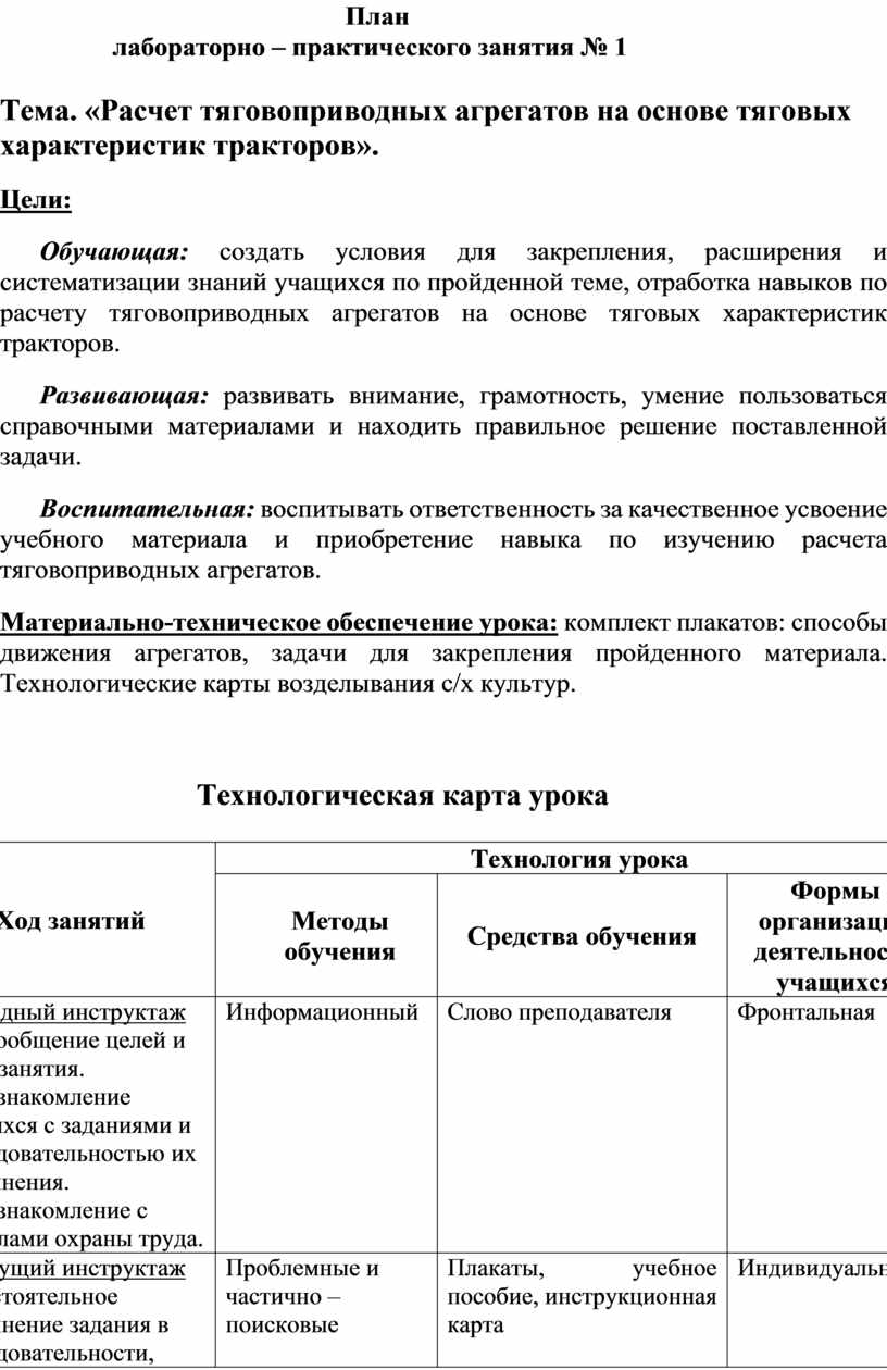 Материально-техническое обеспечение урока: комплект плакатов: способы движения агрегатов, задачи для закрепления пройденного материала. Технологические карты возделывания с/х культур.