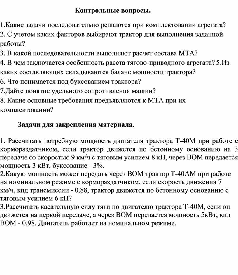 1.Какие задачи последовательно решаются при комплектовании агрегата? 2. С учетом каких факторов выбирают трактор для выполнения заданной работы? 3. В какой последовательности выполняют расчет состава МТА? 4. В чем заключается особенность расета тягово-приводного агрегата? 5.Из каких составляющих складываются баланс мощности трактора? 6. Что понимается под буксованием трактора? 7.Дайте понятие удельного сопротивления машин? 8. Какие основные требования предъявляются к МТА при их комплектовании?