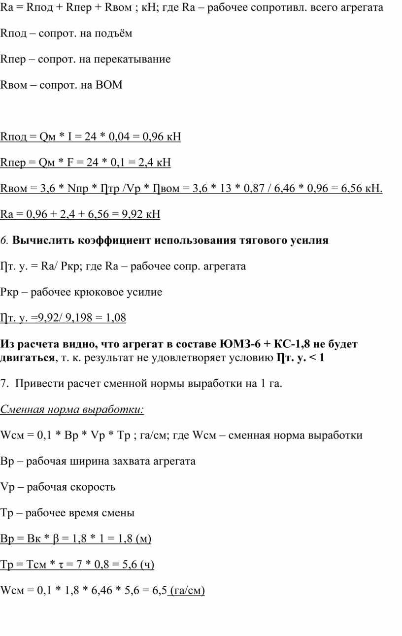 Из расчета видно, что агрегат в составе ЮМЗ-6 + КС-1,8 не будет двигаться, т. к. результат не удовлетворяет условию Ƞт. у. < 1