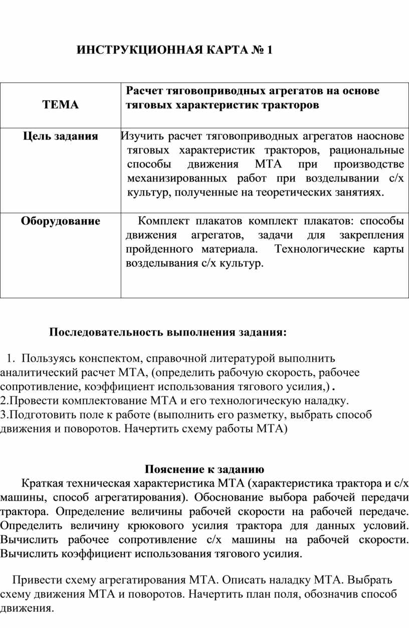 1. Пользуясь конспектом, справочной литературой выполнить аналитический расчет МТА, (определить рабочую скорость, рабочее сопротивление, коэффициент использования тягового усилия,) . 2.Провести комплектование МТА и его технологическую наладку. 3.Подготовить поле к работе (выполнить его разметку, выбрать способ движения и поворотов. Начертить схему работы МТА)