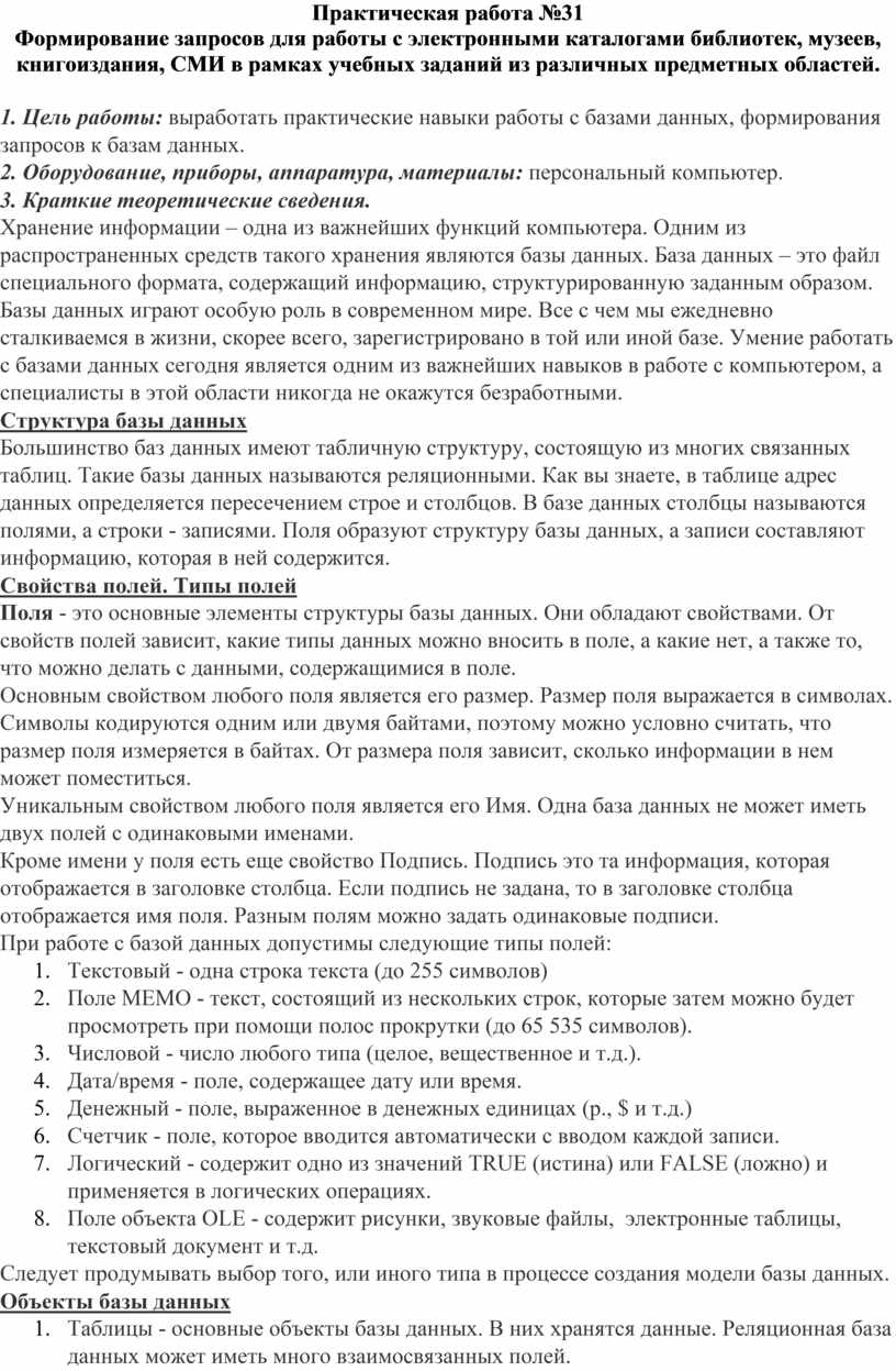 1. Цель работы: выработать практические навыки работы с базами данных, формирования запросов к базам данных.