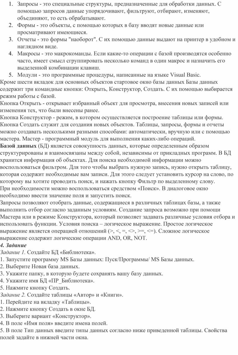 Запросы позволяют отобрать данные, содержащиеся в различных таблицах базы, а также выполнить отбор согласно заданным условиям. Создание запроса возможно при помощи Мастера или в режиме Конструктора, который позволяет задавать различные условия отбора и использовать функции. Условия поиска – логическое выражение. Простое логическое выражение является операцией отношений (>, <, =, <>, >=, <=). Сложное логическое выражение содержит логические операции AND, OR, NOT.