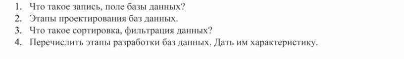 Базой данных (БД) является совокупность данных, которые определенным образом структурированы и взаимосвязаны между собой, независимы от прикладных программ. В БД хранится информация об объектах. Для поиска необходимой информации можно воспользоваться фильтром. Для того чтобы выбрать нужную запись, нужно открыть таблицу, которая содержит необходимые вам записи. Для этого следует установить курсор на слово, по которому вы хотите проводить поиск, и нажать кнопку Фильтр по выделенному слову.