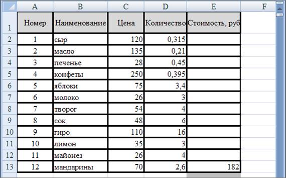 2 Столбец Стоимость заполнить формулами (в ячейку Е2 формулу ввести, в остальные – скопировать).