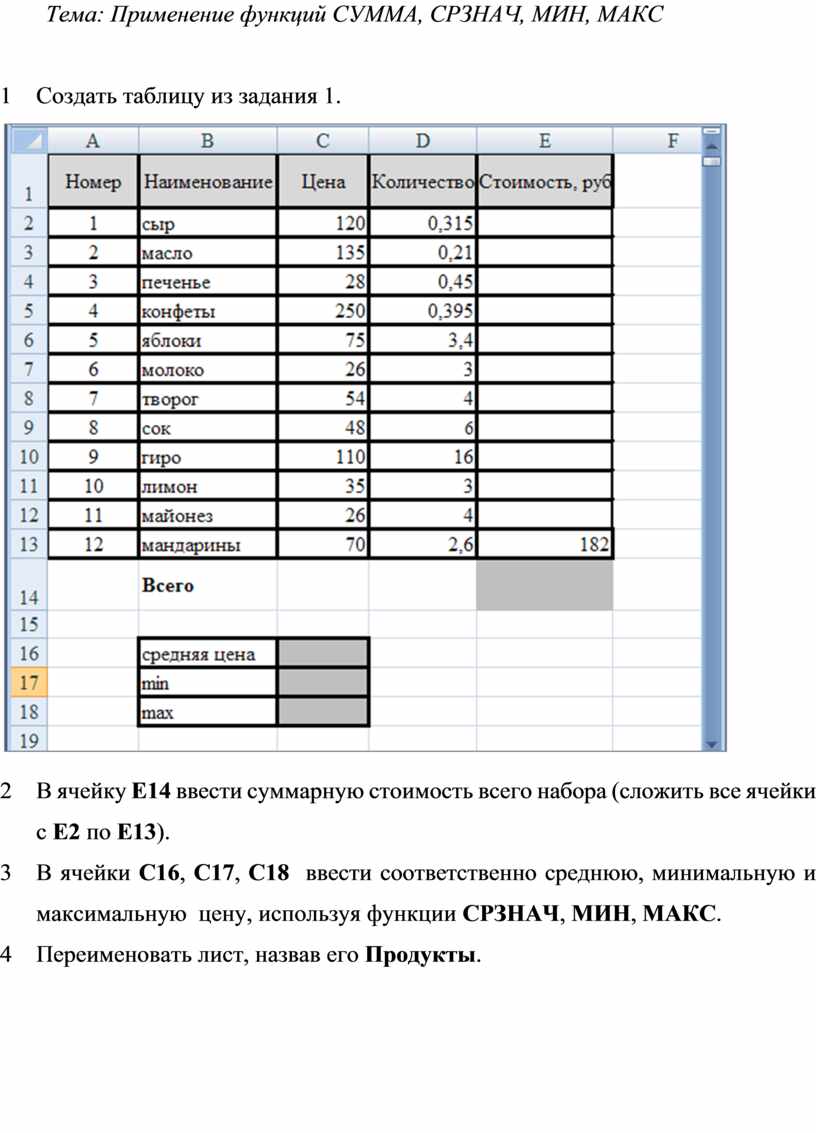 Тема: Применение функций СУММА, СРЗНАЧ, МИН, МАКС