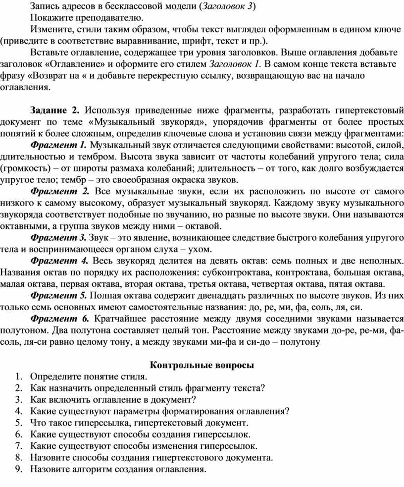 Задание 2. Используя приведенные ниже фрагменты, разработать гипертекстовый документ по теме «Музыкальный звукоряд», упорядочив фрагменты от более простых понятий к более сложным, определив ключевые слова и установив связи между фрагментами: