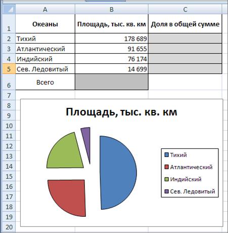 3 В столбце С вычислить долю каждого океана в общей сумме. Для этого площадь каждого океана делить на полученную сумму (Всего).