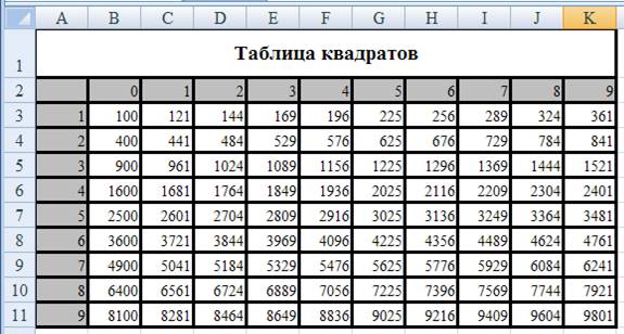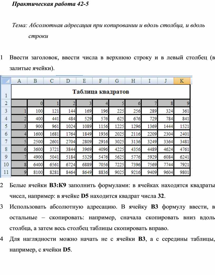 2 Белые ячейки В3:К9 заполнить формулами: в ячейках находятся квадраты чисел, например: в ячейке D5 находится квадрат числа 32.