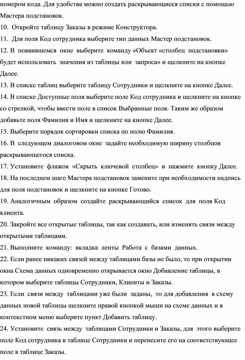 9. Таблица Заказы содержит поля Код сотрудника и Код клиента. При их заполнении могут возникнуть некоторые трудности, так как не всегда удается запомнить все предприятия, с которыми работает фирма, и всех сотрудников с номером кода. Для удобства можно создать раскрывающиеся списки с помощью Мастера подстановок.