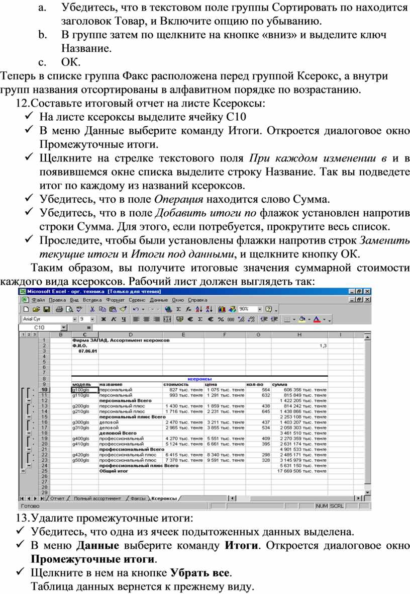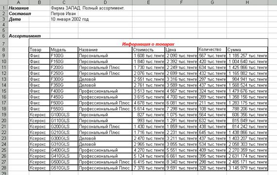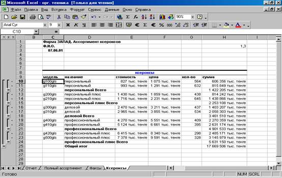 Таким образом, вы получите итоговые значения суммарной стоимости каждого вида ксероксов. Рабочий лист должен выглядеть так:
