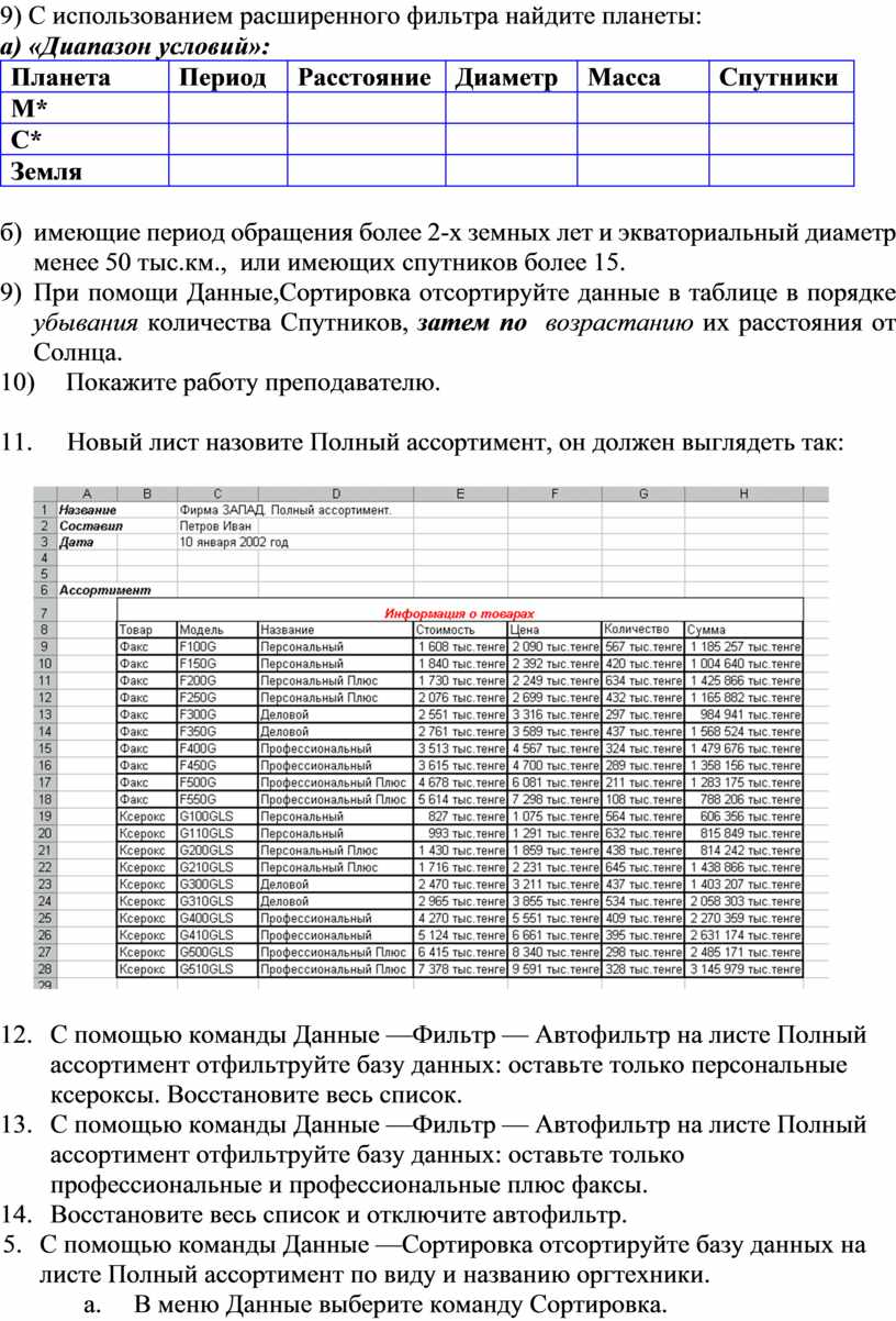 12. С помощью команды Данные —Фильтр — Автофильтр на листе Полный ассортимент отфильтруйте базу данных: оставьте только персональные ксероксы. Восстановите весь список.