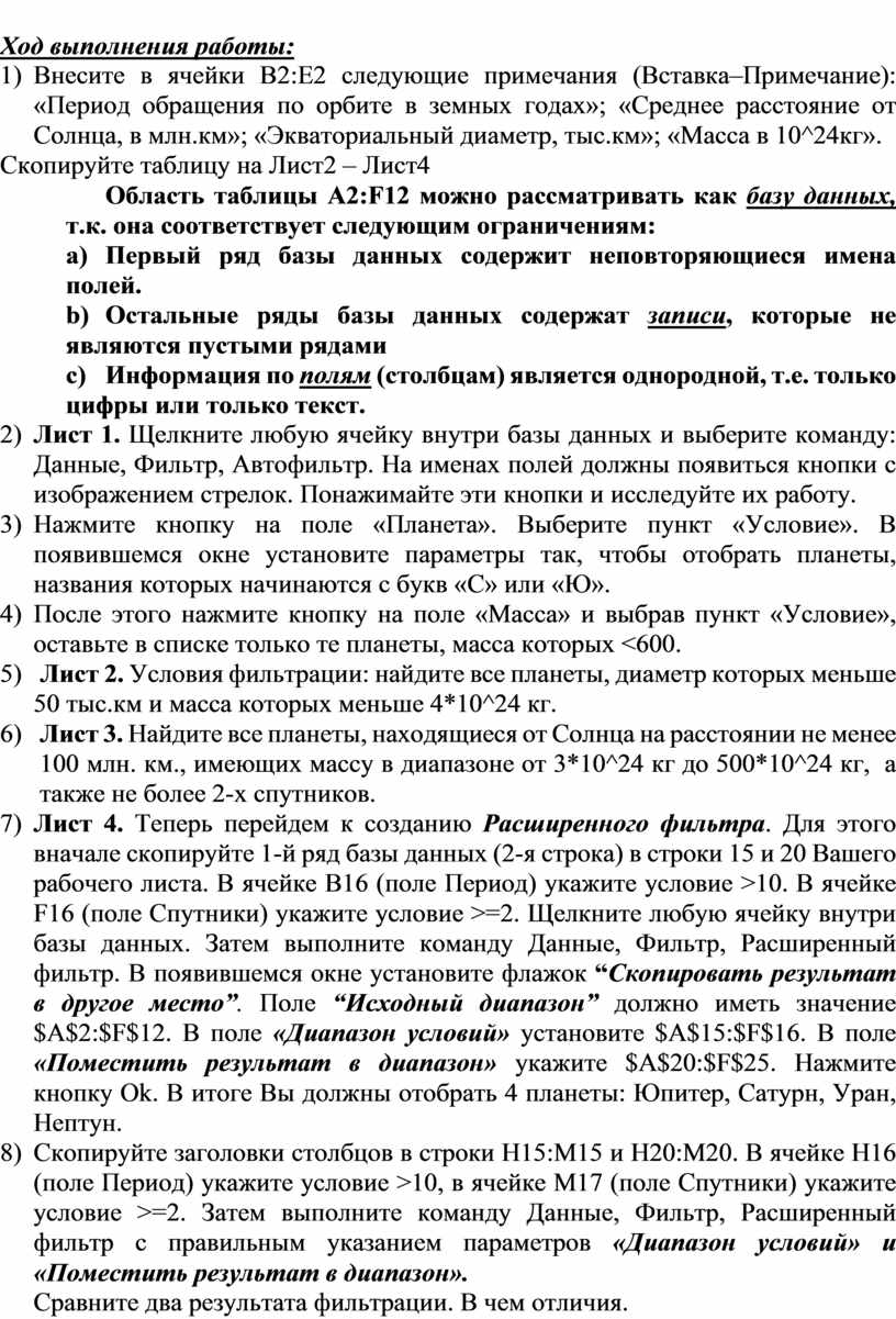 7) Лист 4. Теперь перейдем к созданию Расширенного фильтра. Для этого вначале скопируйте 1-й ряд базы данных (2-я строка) в строки 15 и 20 Вашего рабочего листа. В ячейке B16 (поле Период) укажите условие >10. В ячейке F16 (поле Спутники) укажите условие >=2. Щелкните любую ячейку внутри базы данных. Затем выполните команду Данные, Фильтр, Расширенный фильтр. В появившемся окне установите флажок “Скопировать результат в другое место”. Поле “Исходный диапазон” должно иметь значение $A$2:$F$12. В поле «Диапазон условий» установите $A$15:$F$16. В поле «Поместить результат в диапазон» укажите $A$20:$F$25. Нажмите кнопку Ok. В итоге Вы должны отобрать 4 планеты: Юпитер, Сатурн, Уран, Нептун.