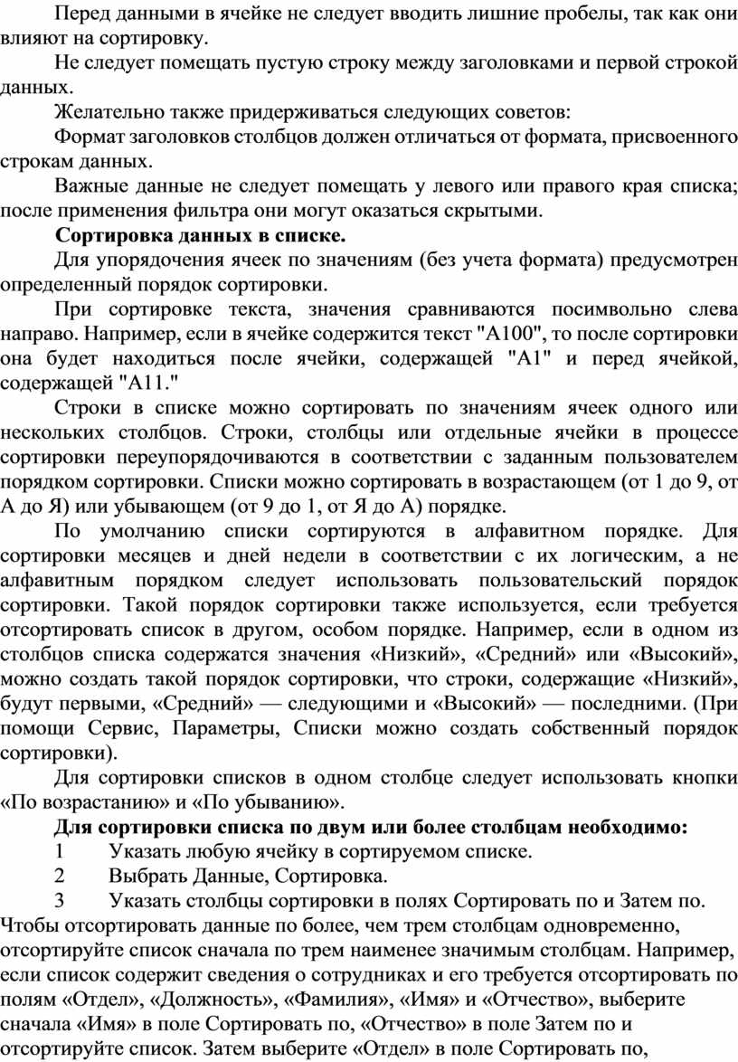 Перед данными в ячейке не следует вводить лишние пробелы, так как они влияют на сортировку.
